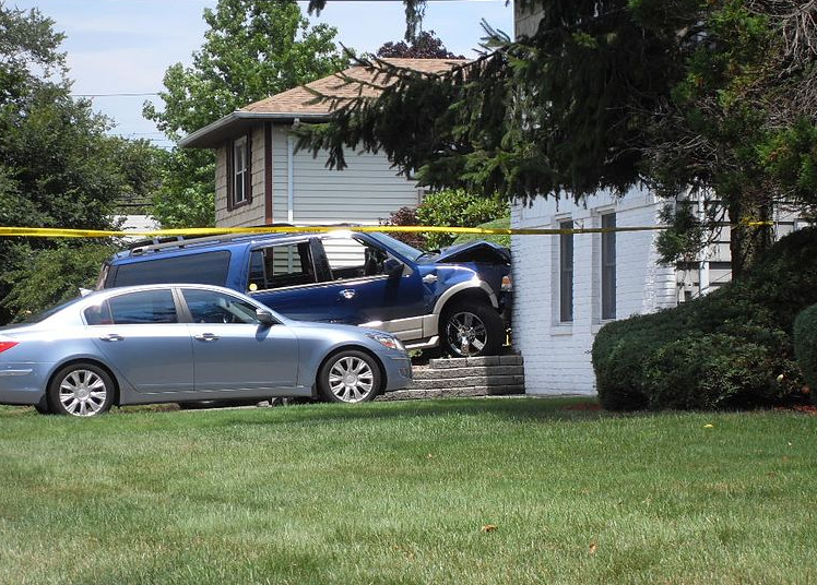 When the vehicle collided with the house, it damaged the exterior gas meter and caused a dangerous release of natural gas.